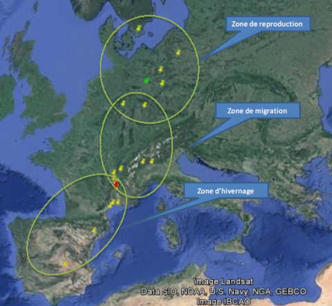 Deux espèces nous permettent aujourd’hui d’avoir des informations sur l’origine et le devenir des oiseaux capturés à Printegarde : le Bruant des roseaux et la Rémiz penduline. L’étude des données de baguage nous apprennent que, pour ces deux espèces, les sites de nidification se situent sur le pourtour de la Mer Baltique et de l’Europe centrale (voir la carte ci-dessous pour la Remiz Penduline). La Vallée du Rhône est utilisée comme couloir de migration mais également comme site d’hivernage. On voit ainsi que le site de Printegarde fait partie d'un continuum de sites importants pour les oiseaux migrateurs européens.